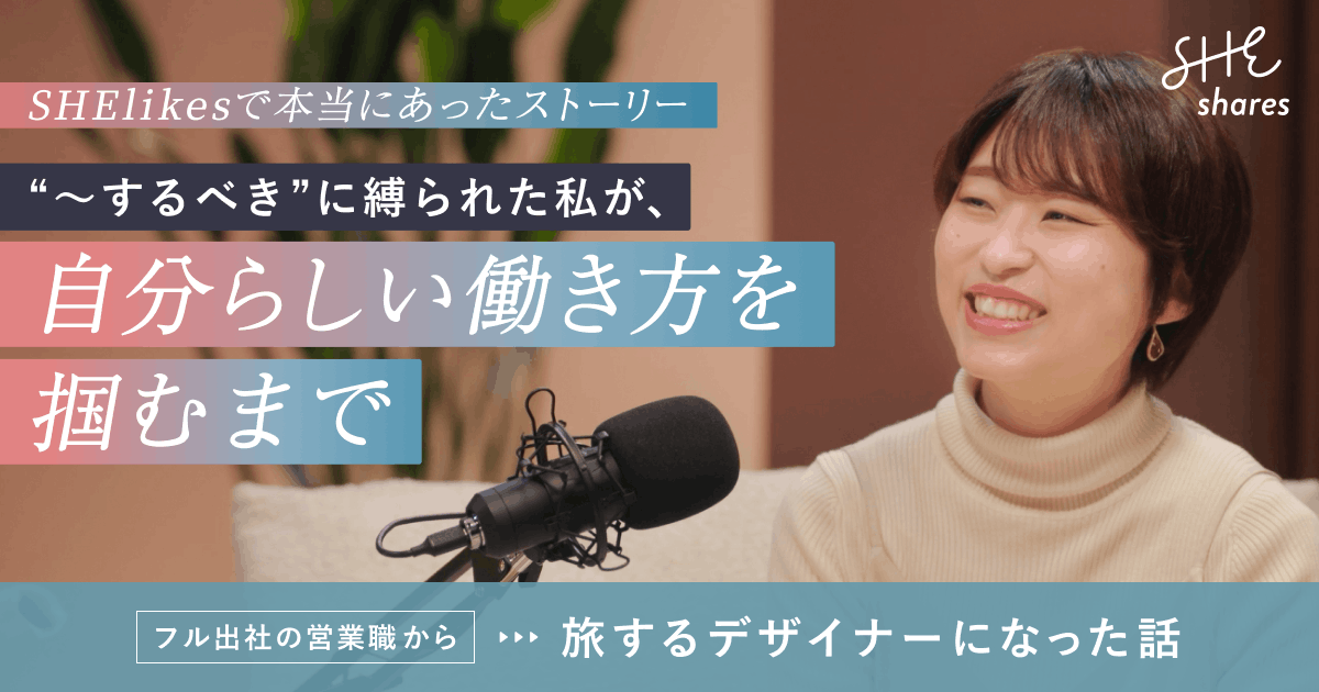 インタビュー 「〜すべき」に囚われた毎日を卒業。フル出社の営業から旅しながら働くデザイナ… 2026/04/27 erina_hashimoto https://shares.shelikes.jp/wp-content/uploads/2023/10/logo_footer.png SHEshares