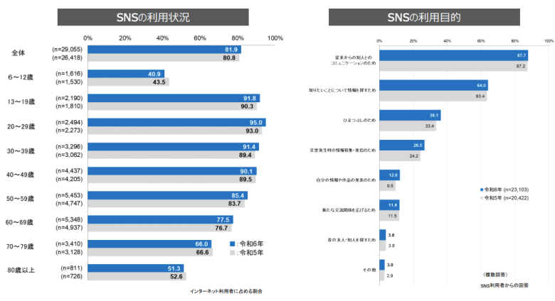 近年、多くの企業にとってSNSは、認知度を高めて売上を伸ばすために欠かせない販促ツールとなっています。総務省の調査データを見ても、SNS利用率は20代から40代で9割を超えており、幅広い世代に深く定着していることがわかります。