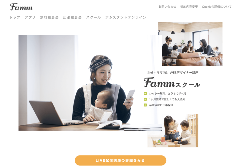 Fammは、在宅ワークを目指す主婦や子育て中の女性に向けたWebデザインスクールです。1ヶ月の短期講座でWebデザインの基礎を学べるため、家事や育児の合間にスキルを身につけたい方に向いています。少人数制の講義で質問しやすく、初心者でも安心して学びやすい環境です。