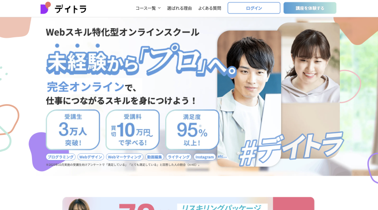 デイトラは、オンラインで学べる買い切り型のWebスキル講座です。比較的リーズナブルな価格で受講できる点が特徴で、コストを抑えて学びたい方に向いています。