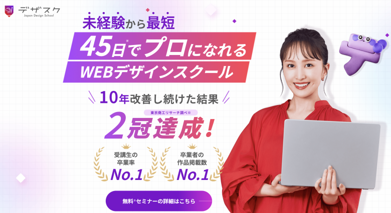 日本デザインスクールは、最短45日でプロを目指せるカリキュラムを提供するWebデザインスクールです。実践的な課題を通してスキルを習得できるカリキュラムが特徴で、短期間でデザインスキルを身につけたい方に向いています。