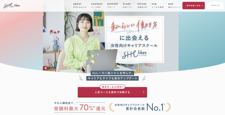 SHElikes(シーライクス)は、私らしい働き方に出会える、女性向けのキャリアスクールです。Webデザインだけでなく、マーケティングやライティングなど50以上の職種スキルを定額で学べるのが特徴。