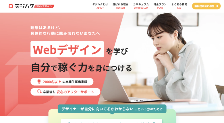 デジハクは、未経験からWebデザインのスキル習得を目指せる実践型のオンラインスクールです。マンツーマンのサポート体制が特徴で、学習の進め方やキャリアについて相談しながら学習を進められます。