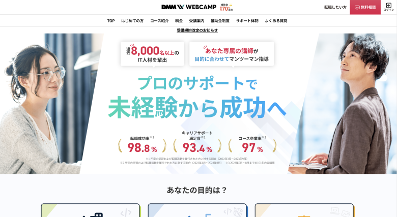 短期間でスキル習得を目指せるコースもあり、働きながら効率よく学びたい社会人に向いています。キャリアサポートも整っており、Web業界への転職を目指す方にもおすすめです。