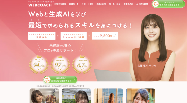 WEBCOACHは、未経験からWebスキルを身につけたい方に向けたオンラインスクールです。マンツーマンコーチングを中心としたサポート体制が特徴で、学習の進め方やキャリアの方向性について相談しながら進められます。