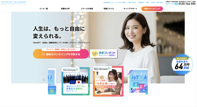 インターネットアカデミーは、Web業界の老舗スクールとして知られています。通学とオンラインの両方に対応しており、社会人でもライフスタイルに合わせて受講しやすい点が特徴です。