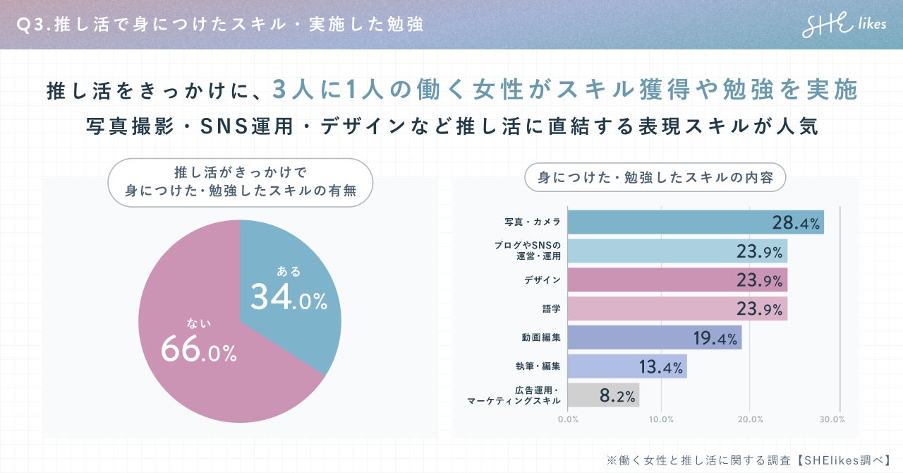推し活がきっかけとなって身につけるスキルとして、写真撮影やSNSの活用、デザインなど、ブログやSNS、二次創作など推し活に直結する表現スキルが人気であることがわかりました。