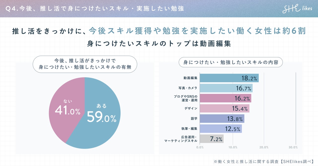 働く女性に「今後、推し活をきっかけに身に着けたい・勉強したいスキルはあるか」を聞くと、59.0%と約6割が何かしらのスキル獲得や勉強を実施したいと回答。「身につけたい・勉強したいスキルの内容」を聞くと、「動画編集」が18.2%でトップでした。SNSでも動画コンテンツが気軽に発信できる時代となり、より一歩踏み込んだ専門的スキルである「動画編集」を身につけたいと考える方が増えていると考えられます。
