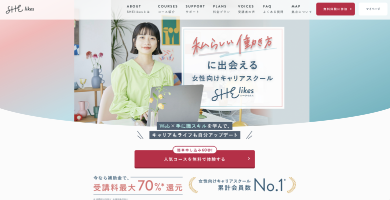 補助金でお得にWebデザインを学ぶなら、女性向けキャリアスクール「SHElikes」がおすすめです。公的な補助金を活用できるだけでなく、受講生が学習を始めやすい独自の工夫が凝らされています。
