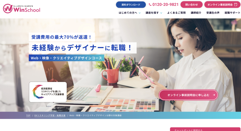 Winスクールは、就職と資格取得に特化した全国展開のパソコン教室です。300以上の豊富なカリキュラムがあり、Webデザイン講座ではサイト制作からUI/UXデザインまで幅広いスキルを学べます。