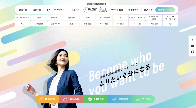 ヒューマンアカデミーは、Webデザイン・エンジニア・AI活用といった幅広い分野で資格取得を目指せるキャリアスクールです。ネイルや介護福祉、漫画、声優などリカレント教育を受けられるコースも開講しています。