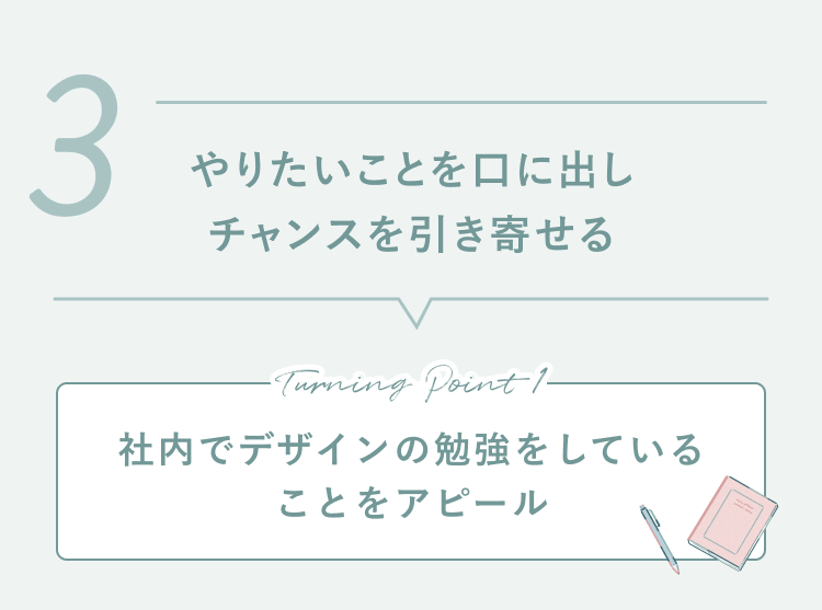 さまざまなコースを受講する中で、デザインの仕事がしたいと思うようになりました。そんなとき、当時勤めていた会社で部署異動の話が。上司との面談で、現在の勉強内容やこれから仕事にしていきたいことを赤裸々に話しました。