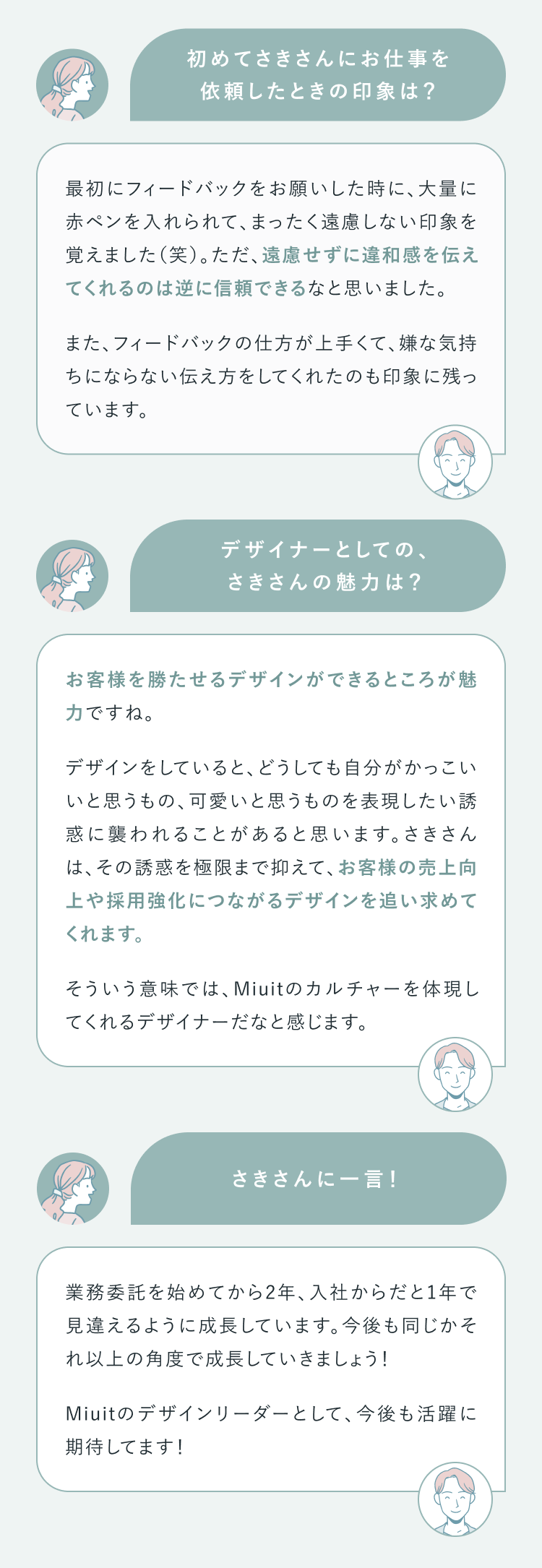 部署異動をしてしばらく経った頃、出張先で出会ったのがMiuitの代表 安井でした。話をする中でデザインの勉強や業務をしていることを伝えると、会社で制作しているデザインのフィードバックをしてほしいと頼まれて。
