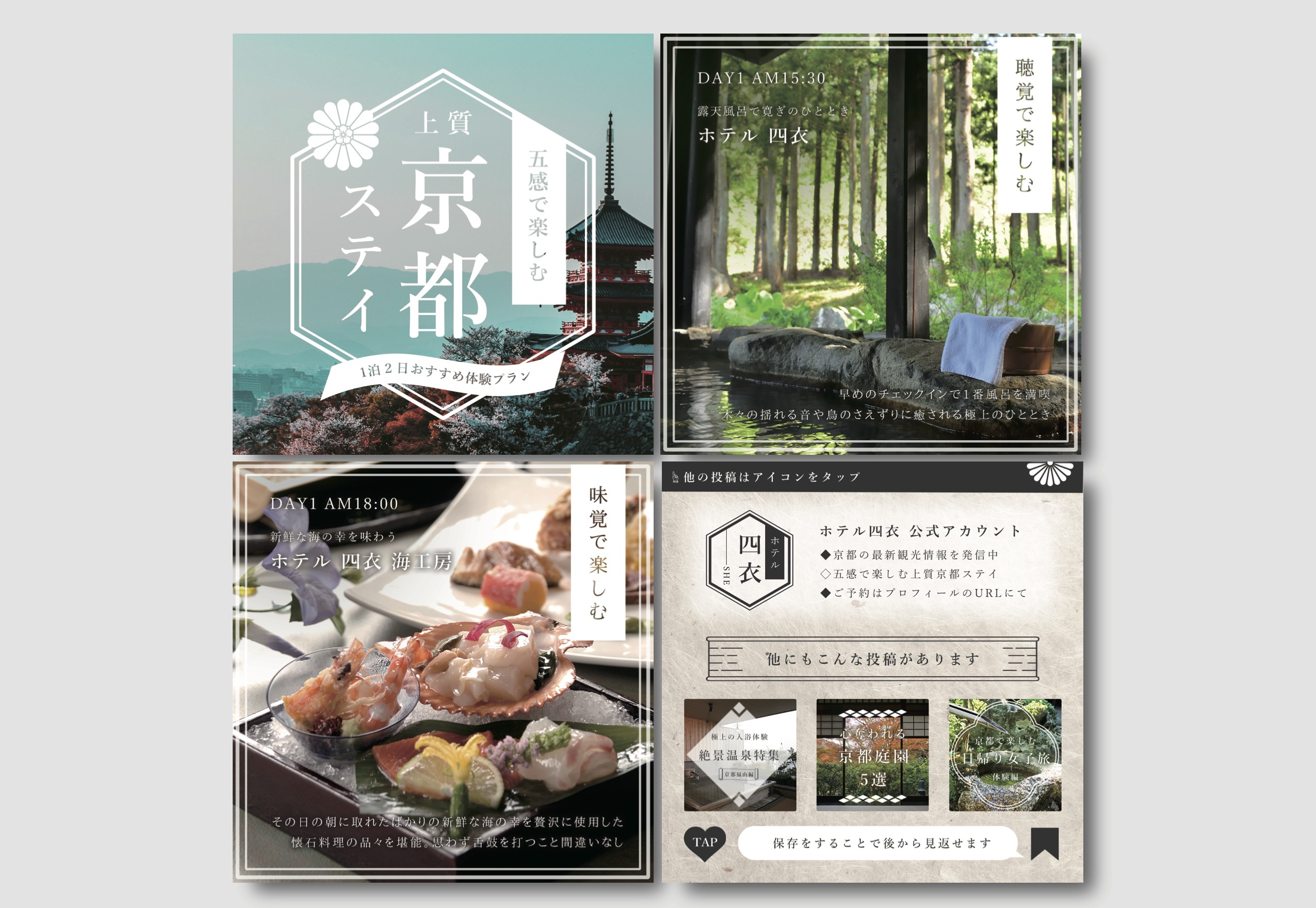 「『京都でできるおすすめ体験』をテーマにした、京都の魅力を伝えるインスタグラムのフィード投稿」というSNSバナー制作の課題。ターゲットを理解したマーケティング視点での企画立案力・素材を活用した画像素材作成スキルを求められた。