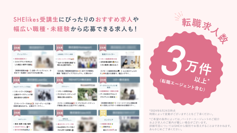 SHElikesは、50以上の職種スキルが定額・学び放題の女性向けキャリアスクール。基礎から学べる入門コースや、講師による丁寧なフィードバック、実案件に挑戦できる機会など、スキル学習〜お仕事獲得までをサポートするコンテンツがもりだくさんなので、未経験からでも安心してスタートできます。