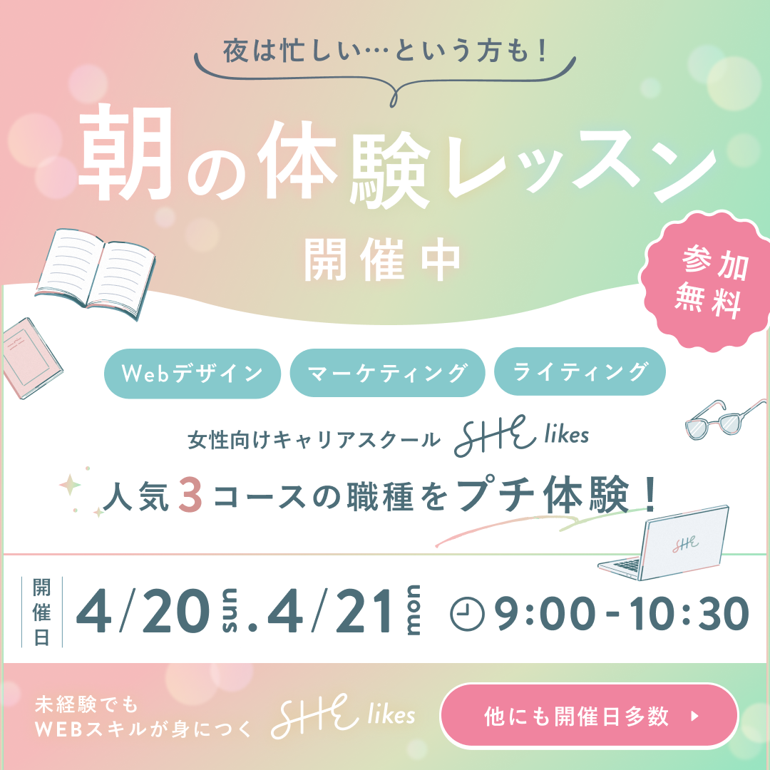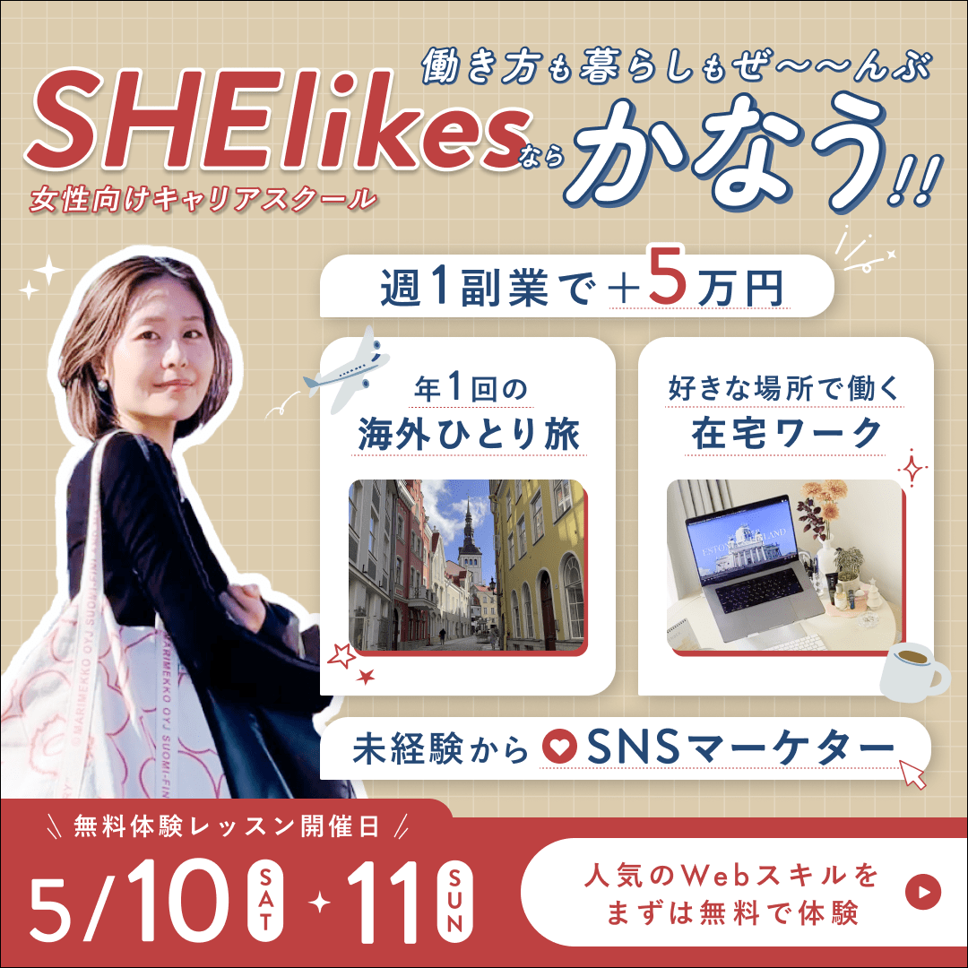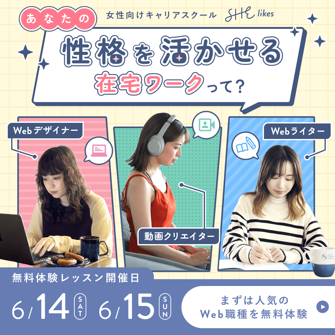 Webデザイン・動画編集・ライティングなど、50以上の職種スキルが定額・学び放題の女性向けキャリアスクールSHElikes(シーライクス)。ほとんどの方が未経験からSHElikesでスキルを学び、入会中・卒業後に関わらず活躍中です。