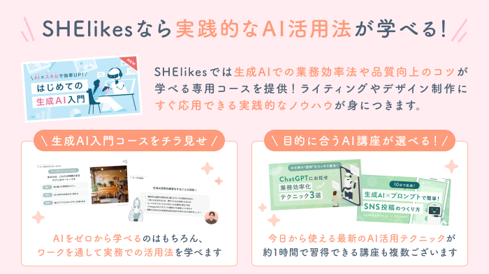 SHElikesでは、従来のWebデザインやライティングだけでなく、AIを活用した最新のスキルも学べる講座が用意されています。