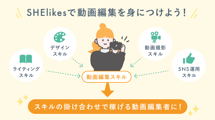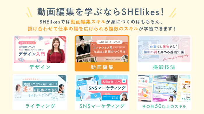 50以上のスキルが学び放題のSHElikesなら、動画編集を軸にしたさまざまな仕事にチャレンジできます。ぜひ参考にしてください。
