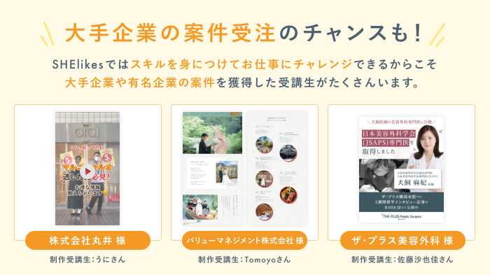 スキルを身につければ、SHElikesから大手企業の案件受注のチャンスも。