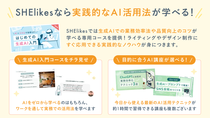 SHElikesで基礎を身につけながらAIを効果的に活用し、人の役に立つクリエイターを目指してみてください。