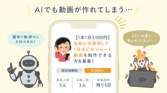 最近では生成AIを活用したコンテンツが増えており、専門スキルがない方でも手軽に動画を作れるようになっています。その結果、未経験者向けの動画編集案件の単価は下がる傾向がみられます。
