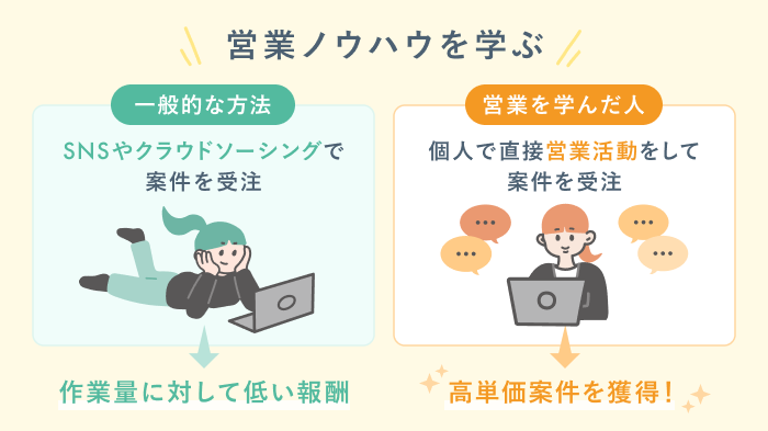 営業が苦手な方はクラウドソーシングから抜け出せず、低単価の案件で疲弊することも。つまり動画編集で安定した収入を得るには、営業スキルも必要になるのです。
