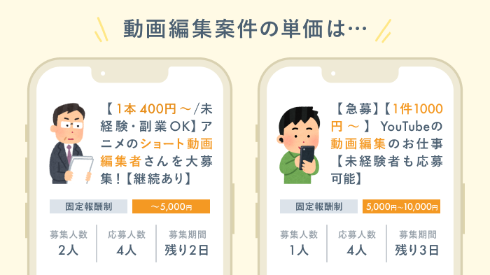 また、動画編集の副業を始める方が増えていることも単価が低くなる一つの理由です。実績作りには活用できますが、クラウドソーシングだけで5万円以上稼ぐのは相当な労力が必要になるかもしれません。