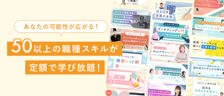 学べるスキル | Webデザイン 動画編集 ライティング マーケティング 起業ノウハウ その他50以上の職種スキル |
