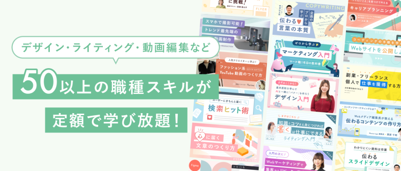 | 学べるスキル | Webデザイン 動画編集 ライティング マーケティング 起業ノウハウ その他50以上の職種スキル |