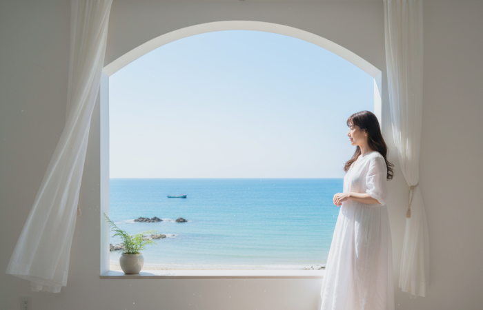 - 波の音で目を覚まし、窓を開けると澄んだ空気が流れ込む。