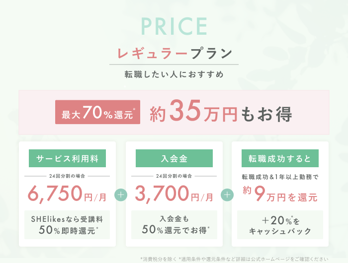 例えばリスキリング補助金を活用できるレギュラープランなら、入会金が50%オフに。24分割払いなら、SHElikesのすべてのサービスを月額10,450円で利用できます。