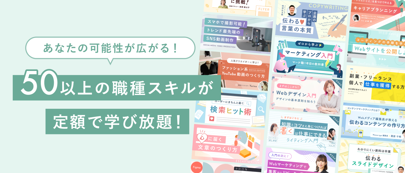 SHElikesは、デザインやライティング、マーケティングや動画編集など、計50以上のスキルが定額で学び放題です。
