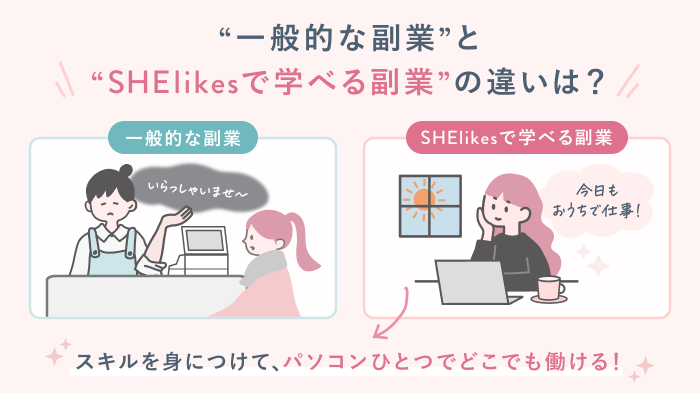 | SHElikesで学べる副業 | 成果物に対する成果報酬 | ・実績・スキルによって報酬が高くなる ・仕事の時間・場所を自分で選べる ・個人で稼げるようになる ・手に職がつく |