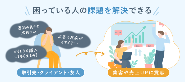 たとえば、集客や認知拡大に悩んでいる家族・友人がいる場合、あなたのスキルでビジネスを改善することが可能になります。