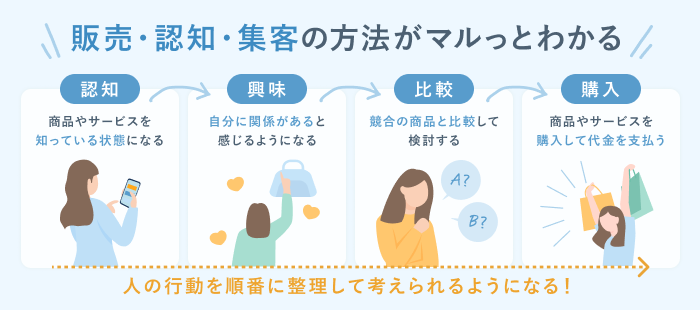 Webマーケティングを学ぶ最大のメリットは、「認知→興味→比較→購入」といった人の行動を順番に整理して考えられるようになります。