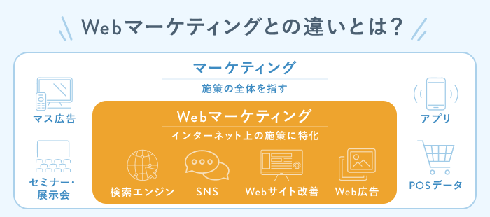 つまり、マーケティングが全体戦略で、Webマーケティングはその一部を担う実践手法といえるでしょう。