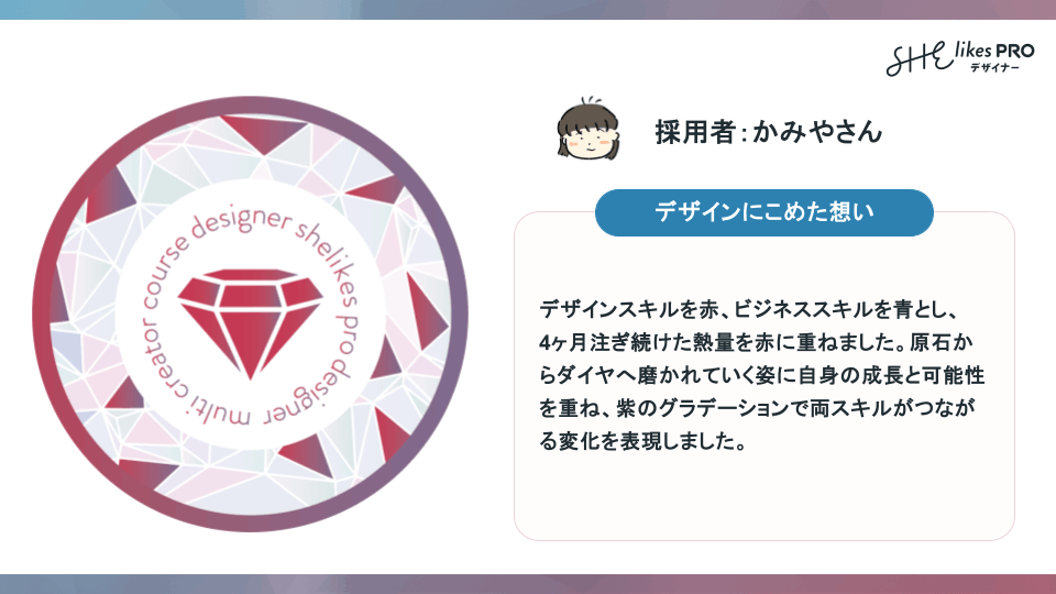 「この数字は“事業の大きさ”というより、“積み重なってきた時間”だと感じています。今、SHElikesの中でもプロデは、デザインに特化した学びの場として、そしてマインドを変化させる場として、しっかりとした存在感を持つようになってきました。