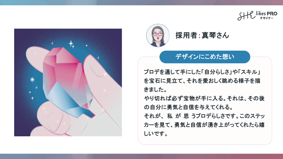 「プロデを通して手に入れた自分らしさやスキルを、宝石に見立てて表現しました。4ヶ月を終えたときに手の中に残るものは、形も色も大きさも人それぞれです。『これが私なんだ』と喜ぶ人もいれば、『もっとできたはず』と悔しい気持ちの人もいるかもしれません。