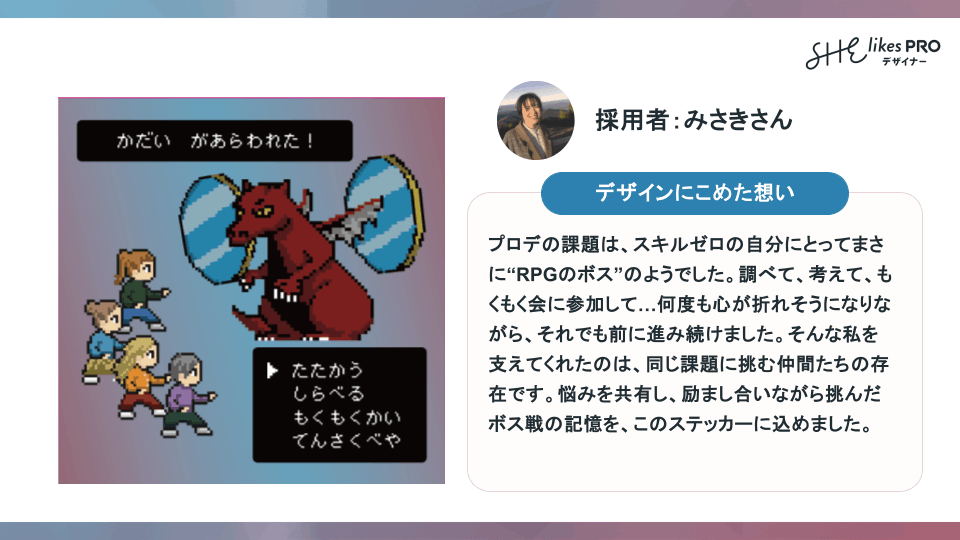 「プロデの課題は、スキル0から挑んだ私にとって、まさにRPGのボス戦。調べて、試して、もくもく会で質問して。経験値を積み、確実にレベルアップしていく時間でした。攻略法が見つからず、立ち止まることもありましたが、そんなときに支えてくれたのが仲間の存在です。そのことを思い出せるようなステッカーを制作しました。