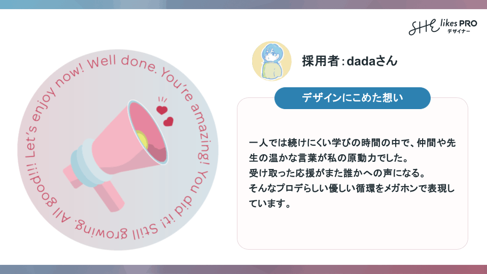 そんな“誰もが誰かの応援隊”のような関係性や、あたたかな声が循環していくイメージを込めて、メガホンをモチーフにデザインしました。自然と応援したくなる空気感や、前向きな言葉が人を支える文化を思い出しながら、皆さんそれぞれの体験と重ねてもらえたら嬉しいです。」