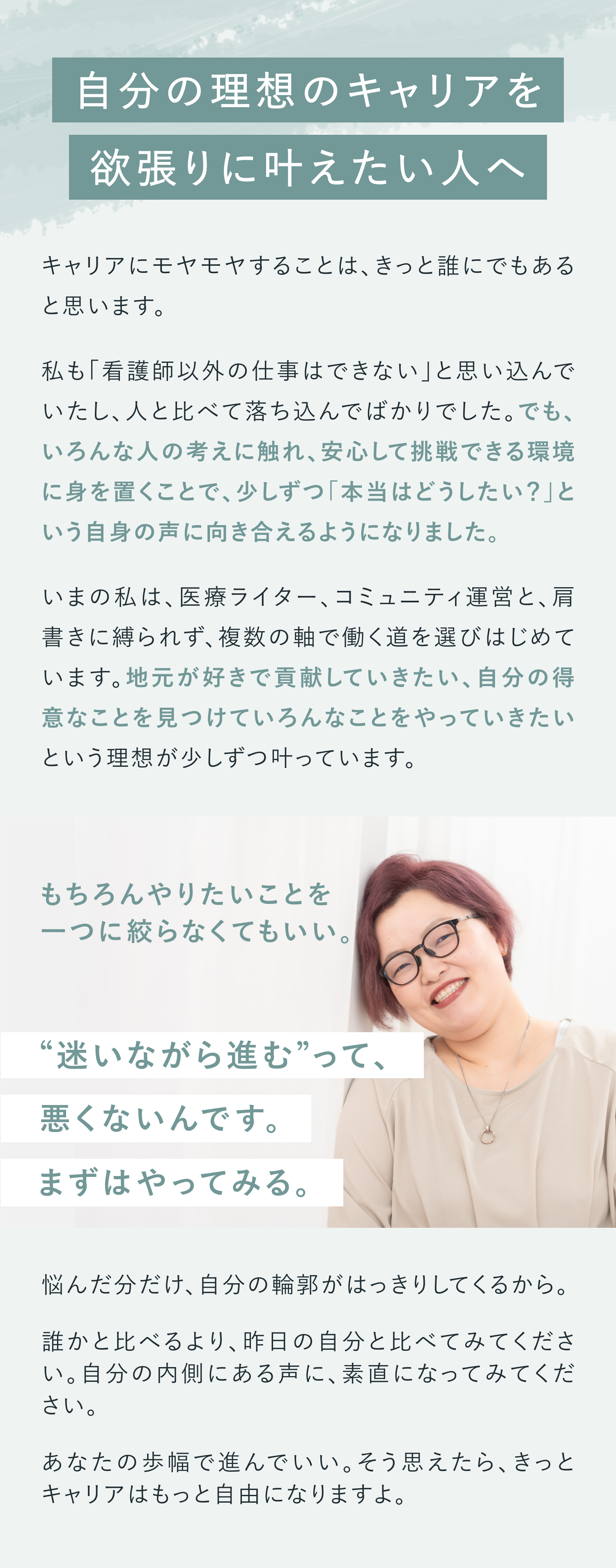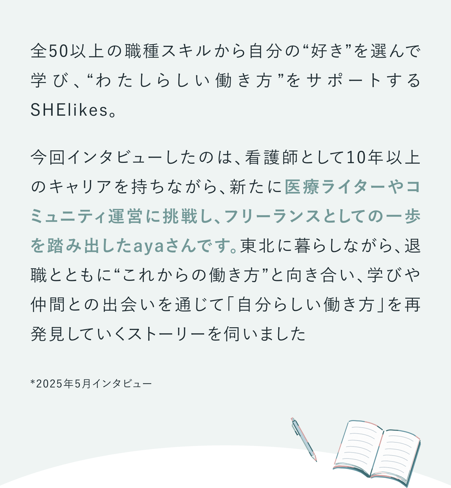 今回インタビューしたのは、看護師として10年以上のキャリアを持ちながら、新たに医療ライターやコミュニティ運営に挑戦し、フリーランスとしての一歩を踏み出したayaさんです。東北に暮らしながら、退職とともに“これからの働き方”と向き合い、学びや仲間との出会いを通じて「自分らしい働き方」を再発見していくストーリーを伺いました。