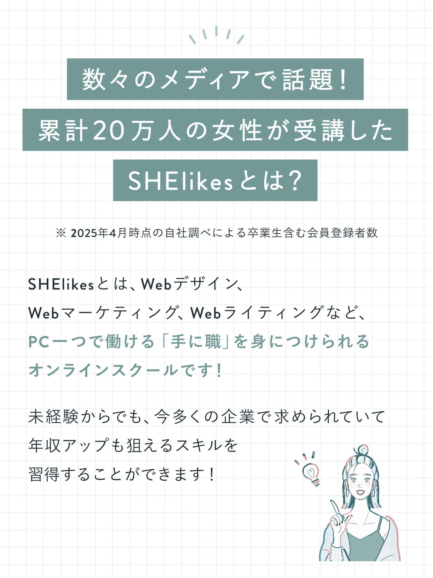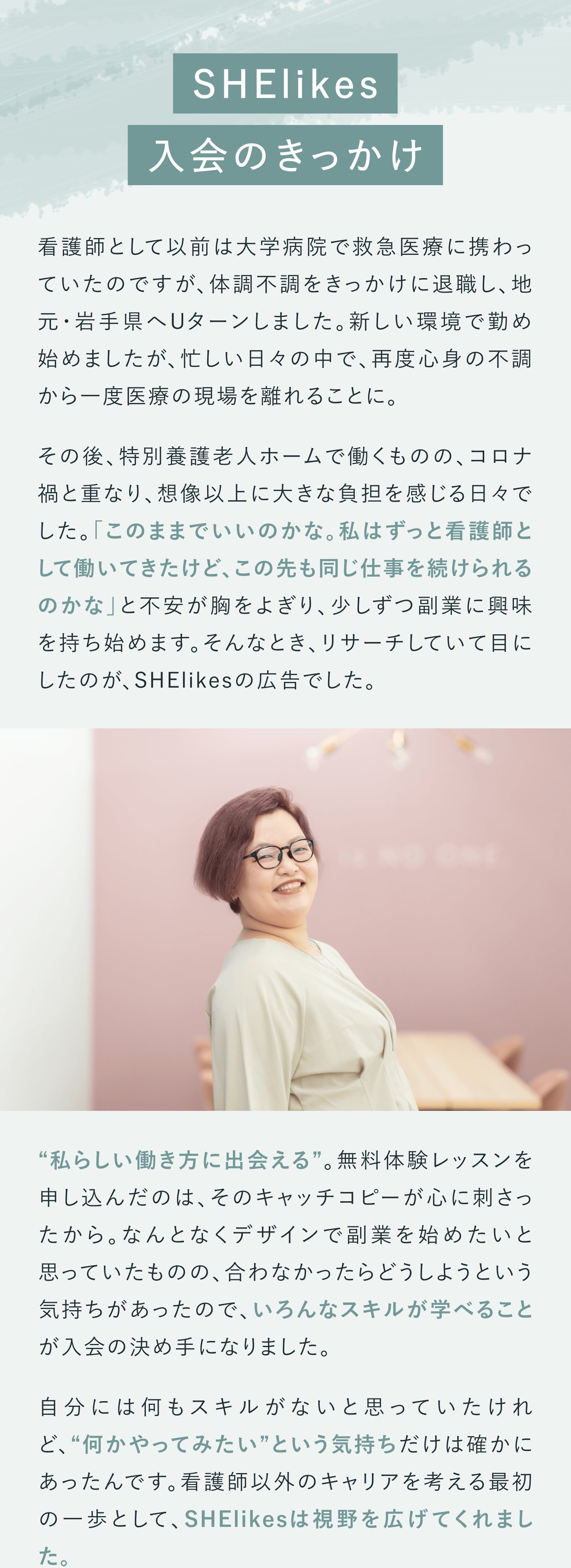 保育士として働きながらキャリアアップを目指しSHElikesに入会。現在はWebデザイナーとして新たな挑戦を重ね、自分らしい働き方を築く小学生2人の母。